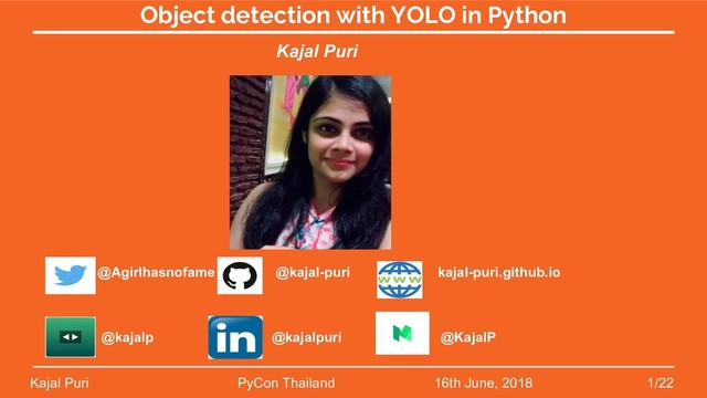 Inception can behave as an object detector by sliding a small window across the image. • For each window, the classifier will give thousands of prediction of the object but only the most certain (high confidence score) prediction category will be taken into consideration. • YOLO divides the image into a grid of NXN cells for predicting a certain number of bounding boxes • The higher the confidence score for a category, the thicker bounding box will be formed around it to prove the certainty. • The confidence score combines with the class prediction score which gives probability that a bounding box contains a specific type of object. Kajal Puri PyCon Thailand 17th June, 2018 12/22
