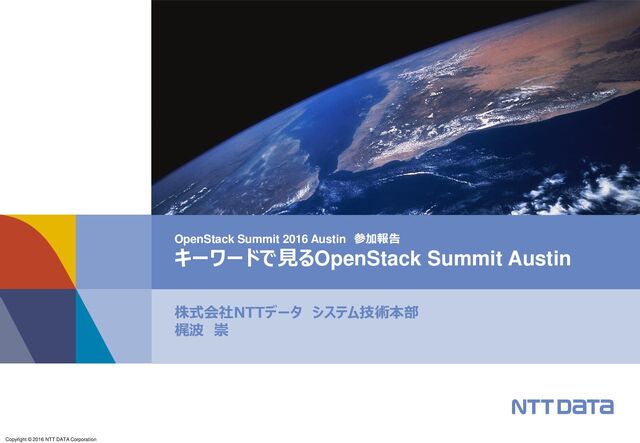 2016年4月24日から29日に、米国Austinで開催されたOpenStack Summit 2016 Austinについて、いくつかのキーワードを軸にセッションをご紹介します。(2016年6月22日報告会資料)