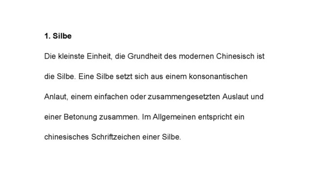 ist die Silbe. Eine Silbe setzt sich aus einem konsonantischen Anlaut, einem einfachen oder zusammengesetzten Auslaut und einer Betonung zusammen. Im Allgemeinen entspricht ein chinesisches Schriftzeichen einer Silbe.