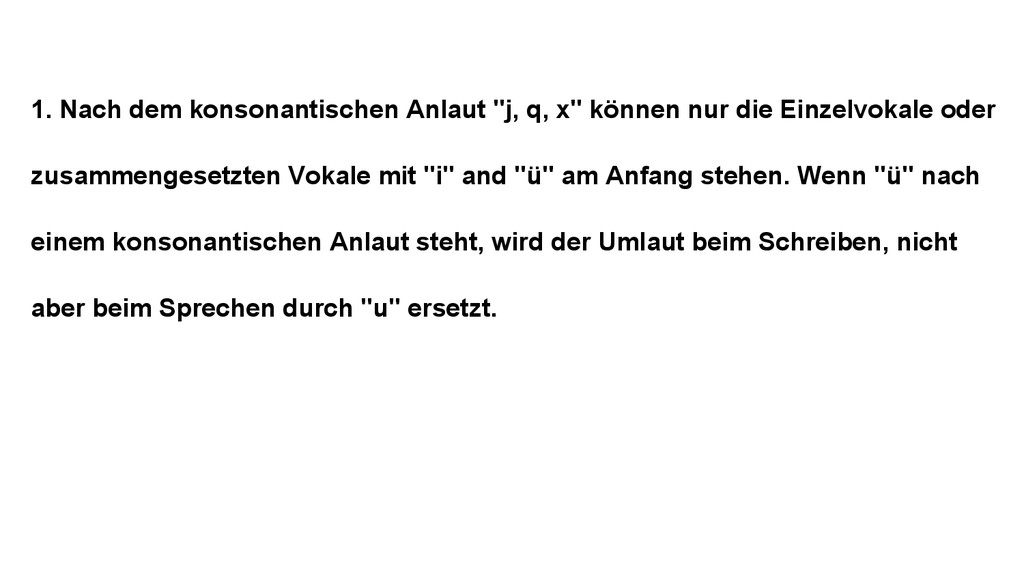 die Einzelvokale oder zusammengesetzten Vokale mit "i" and "ü" am Anfang stehen. Wenn "ü" nach einem konsonantischen Anlaut steht, wird der Umlaut beim Schreiben, nicht aber beim Sprechen durch "u" ersetzt.