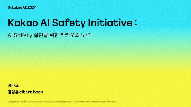 발표자 : albert.hoon 카카오 AI Safety 리더 알버트입니다. 카카오 AI 서비스의 안전성을 높이기 위한 기술과 정책 업무를 담당하고 있습니다.