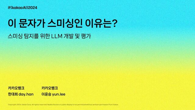 발표자 : day.han, yun.lee 기술로 세상을 안전하게 지키는 Day입니다. 편리한 금융 생활을 위한 AI기술을 연구하는 Yun입니다.