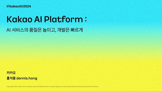 본 세션에서는 카카오가 AI 서비스 개발과 운영을 위해 구축한 Kakao AI Platform (KAP)에 대해 소개합니다. KAP은 AI Ops 에 필요한 핵심 기능들(Store, Serving, Training, Agent)을 통합 제공하는 AI 플랫폼입니다. 플랫폼 엔지니어링적 접근으로 KAP을 활용해 AI 기술의 빠른 확산과 업무 생산성을 향상시킨 사례들을 소개합니다.