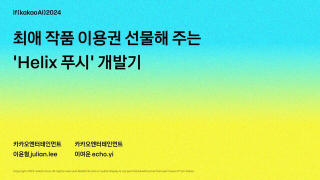 발표자 : julian.lee, echo.yi 줄리안 - AI Lab에서 추천시스템 개발을 담당하고 있습니다. 에코 - AI Lab에서 자연어처리를 담당하고 있습니다.