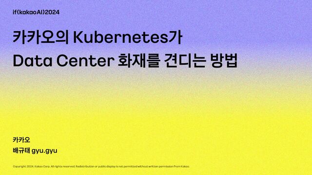 판교 Data Center 화재 이후, 카카오의 Kubernetes 구조를 개선한 경험과 이를 구현하면서 겪었던 다양한 문제와 고민에 대해 이야기합니다. Data Center 화재 시, 실제 Kubernetes에 발생했던 여러 문제를 공유하고, 고가용성 Kubernetes 클러스터를 제공하기 위한 설계 아이디어를 공유합니다. 또한 고가용성을 위해 고민했던 etcd, CNI Plugin에 대해서도 설명합니다.
