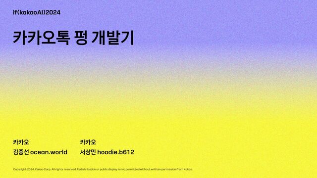 발표자 : ocean.world, hoodie.b612 ocean: 카카오톡 플랫폼 개발하는 오션입니다. 파트내 웃음을 담당하고 있습니다. hoodie: 카카오톡 플랫폼을 개발하는 후디입니다. 후드티 좋아해서 후디입니다.