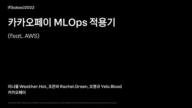 Corp. All rights reserved. Redistribution or public display is not permitted without written permission from Kakao. 카카오페이 MLOps 적용기 if(kakao)2022 (feat. AWS)