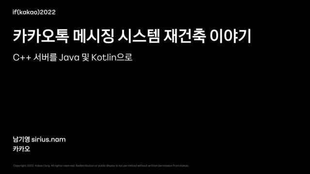 rights reserved. Redistribution or public display is not permitted without written permission from Kakao. 카카오톡 메시징 시스템 재건축 이야기 남기영 sirius.nam 카카오 if(kakao)2022