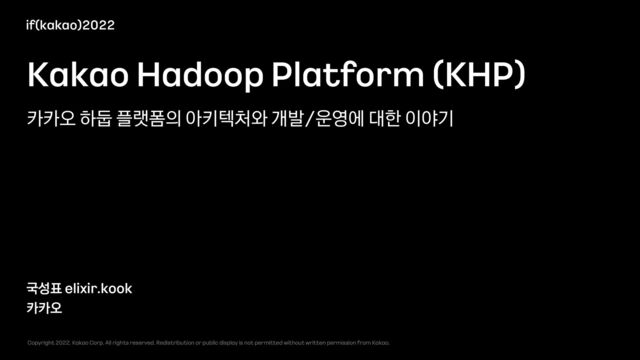 Corp. All rights reserved. Redistribution or public display is not permitted without written permission from Kakao. Kakao Hadoop Platform (KHP) 국성표 elixir.kook 카카오 if(kakao)2022