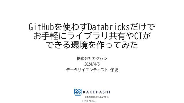 日本の医療体験を、しなやかに。 © KAKEHASHI Inc. 株式会社カケハシ 2024/4/5 データサイエンティスト 保坂 GitHubを使わずDatabricksだけで お手軽にライブラリ共有やCIが