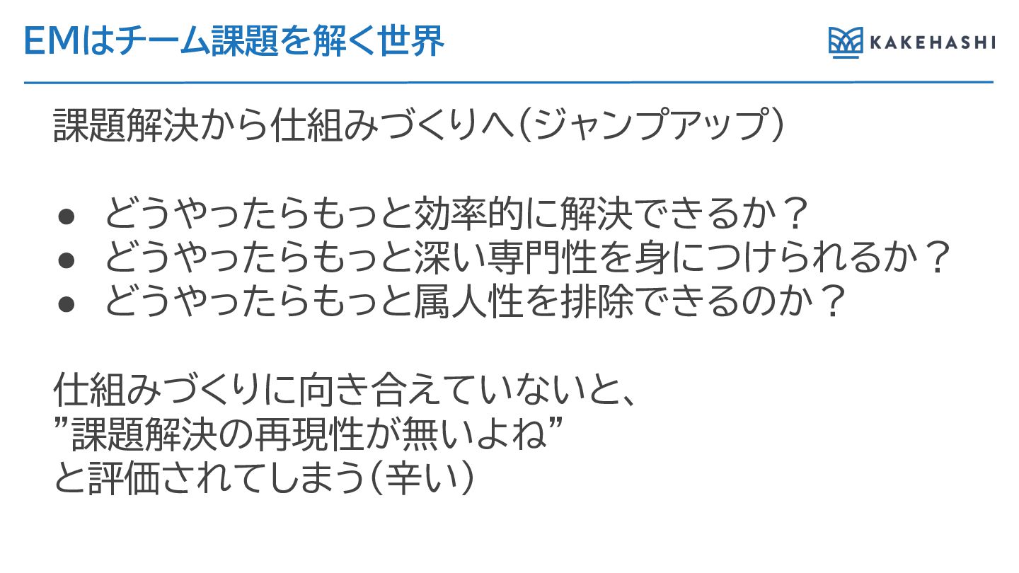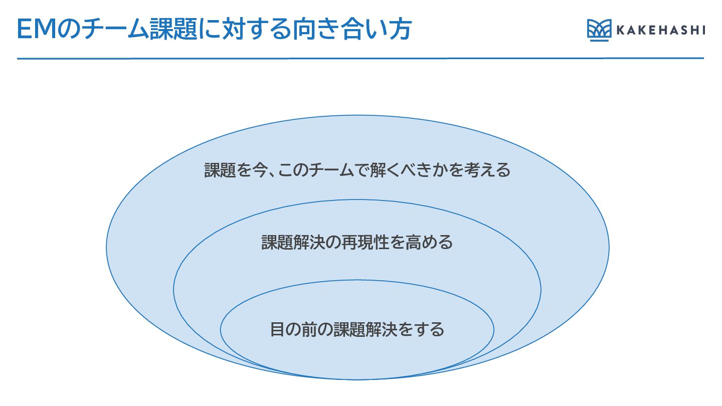 EMのチーム課題に対す 向き合い方 課題を今、このチームで解くべきかを考え 課題解決の再現性を高め 目の前の課題解決をす
