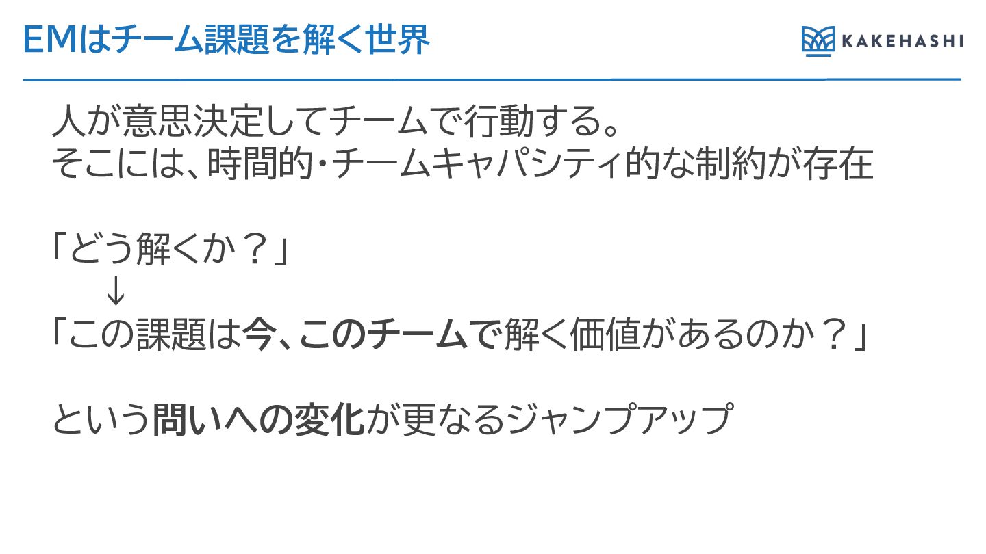 EMはチーム課題を解く世界 人が意思決定してチームで行動す 。 そこには、時間的・チームキャパシティ的な制約が存在 「どう解くか?」 ↓ 「この課題は今、このチームで解く価値があ のか?」 という問いへの変化が更な ジャンプアップ