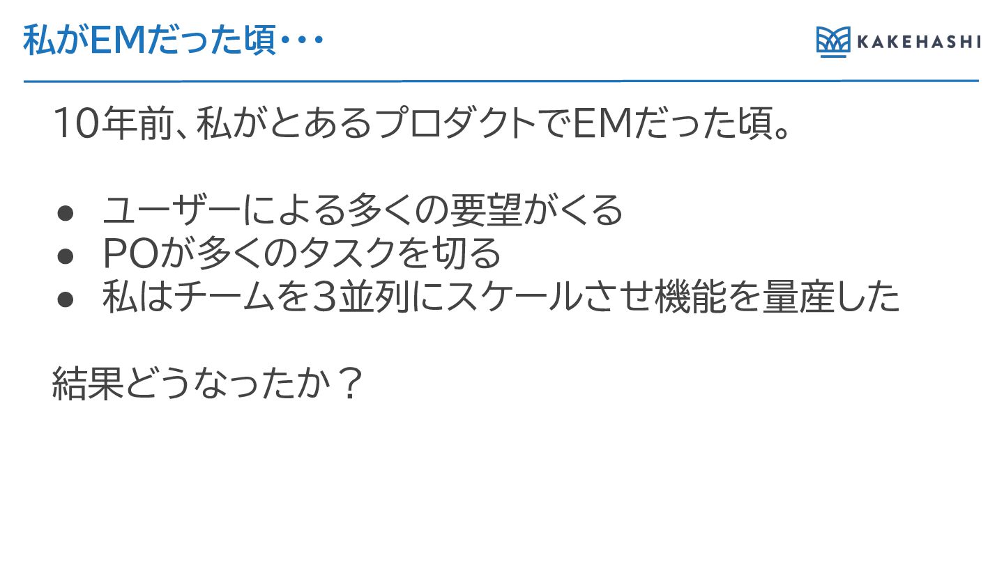 私がEMだった頃・・・ 10年前、私がとあ プロダクトでEMだった頃。 • ユーザーに 多くの要望がく • POが多くのタスクを切 • 私はチームを3並列にスケールさせ機能を量産した