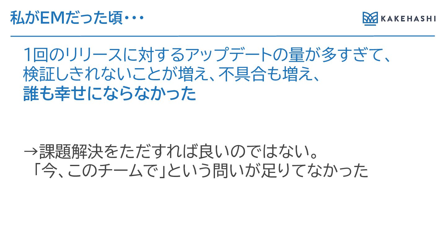 私がEMだった頃・・・ 1回のリリースに対す アップデートの量が多すぎて、 検証しき ないことが増え、不具合も増え、 誰も幸せにな なかった →課題解決をただす ば良いのではない。 「今、このチームで」という問いが足
