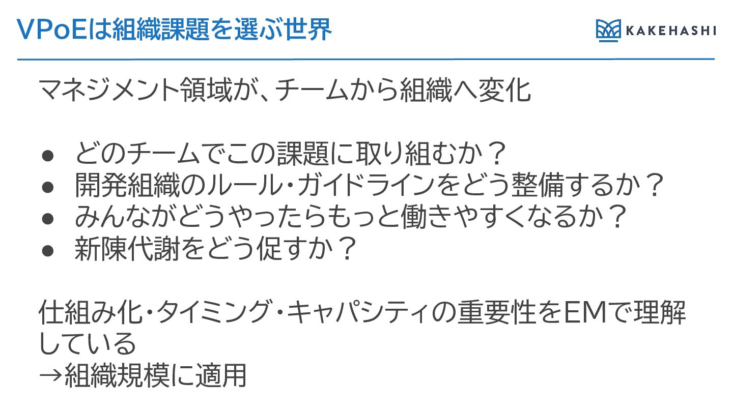 VPoEは組織課題を選ぶ世界 マネジメント領域が、チームか 組織へ変化 • どのチームでこの課題に取 組むか? • 開発組織のルール・ガイドラインをどう整備す か? •
