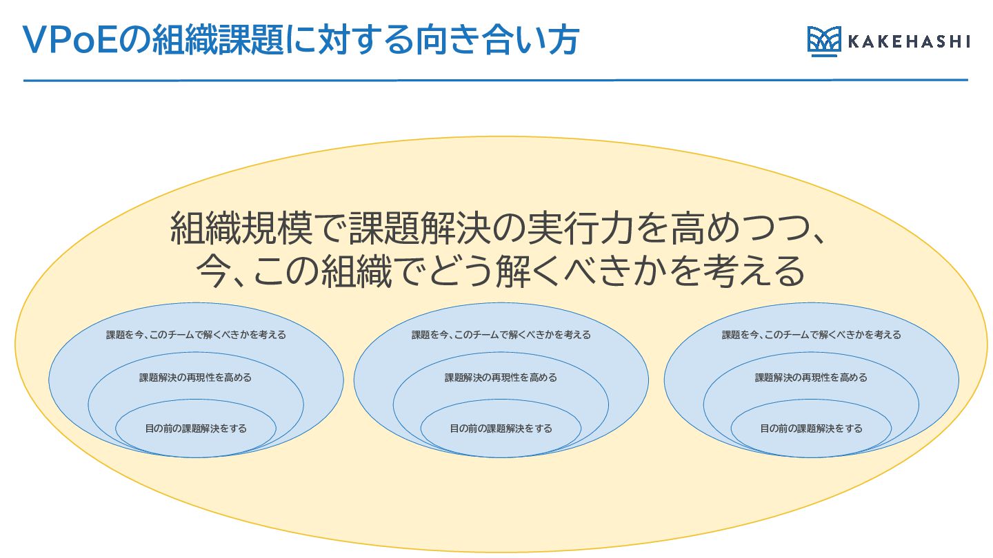 組織規模で課題解決の実行力を高めつつ、 今、この組織でどう解くべきかを考え VPoEの組織課題に対す 向き合い方 課題を今、このチームで解くべきかを考え 課題解決の再現性を高め 目の前の課題解決をす 課題を今、このチームで解くべきかを考え 課題解決の再現性を高め 目の前の課題解決をす