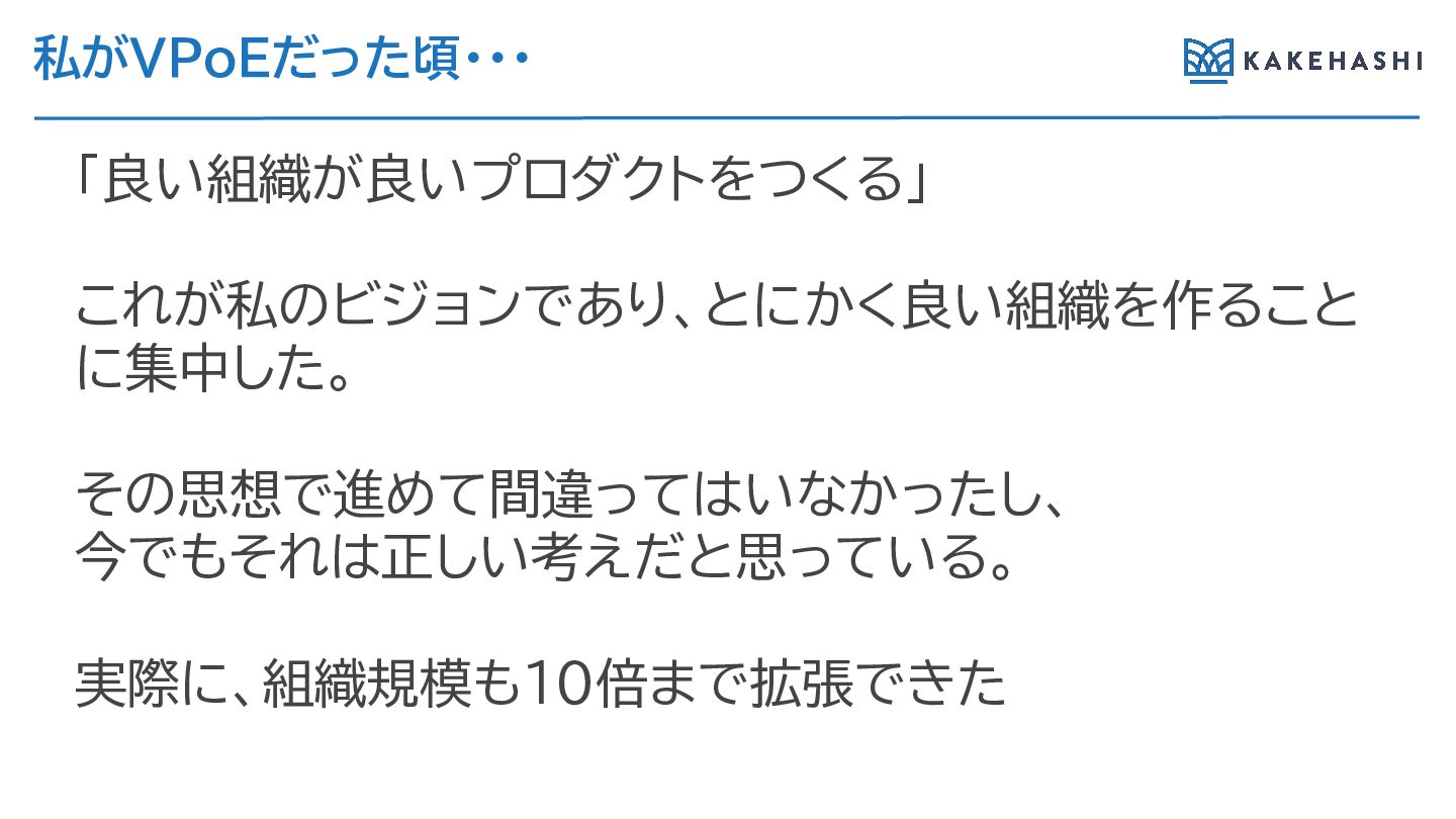私がVPoEだった頃・・・ 「良い組織が良いプロダクトをつく 」 こ が私のビジョンであ 、とにかく良い組織を作 こと に集中した。 その思想で進めて間違ってはいなかったし、 今でもそ