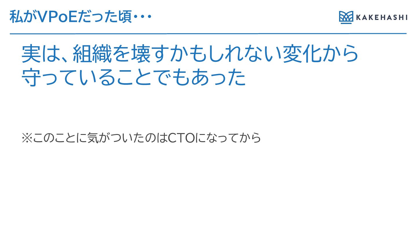 私がVPoEだった頃・・・ 実は、組織を壊すかもし ない変化か 守ってい ことでもあった ※このことに気がついたのはCTOになってか
