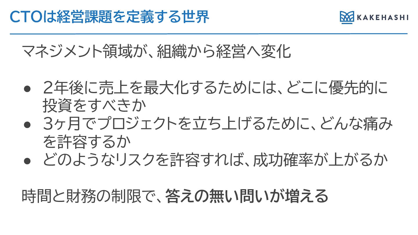 CTOは経営課題を定義す 世界 マネジメント領域が、組織か 経営へ変化 • 2年後に売上を最大化す ためには、どこに優先的に 投資をすべきか • 3ヶ月でプロジェクトを立ち上げ