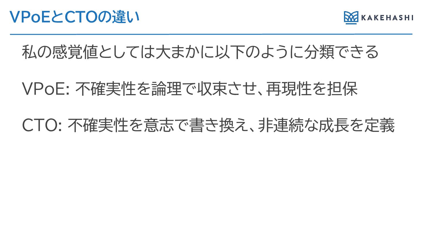 VPoEとCTOの違い 私の頭の中では大まかに以下の うに分類してい VPoE: 不確実性を論理で収束させ、再現性を担保 CTO: 不確実性を意志で書き換え、非連続な成長を定義