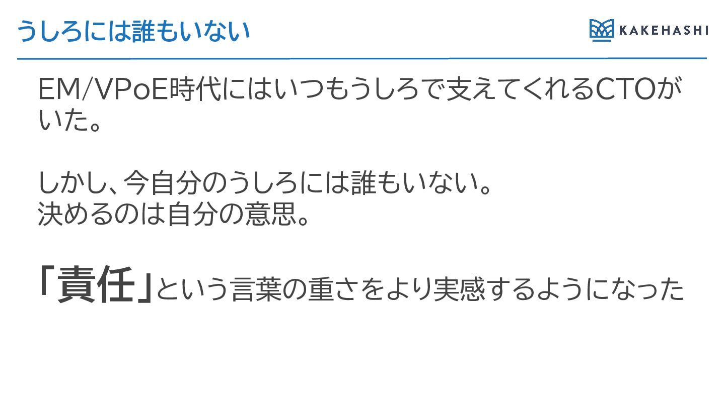 うし には誰もいない EM/VPoE時代にはいつもうし で支えてく CTOが いた。 しかし、今自分のうし には誰もいない。 決め のは自分の意思。