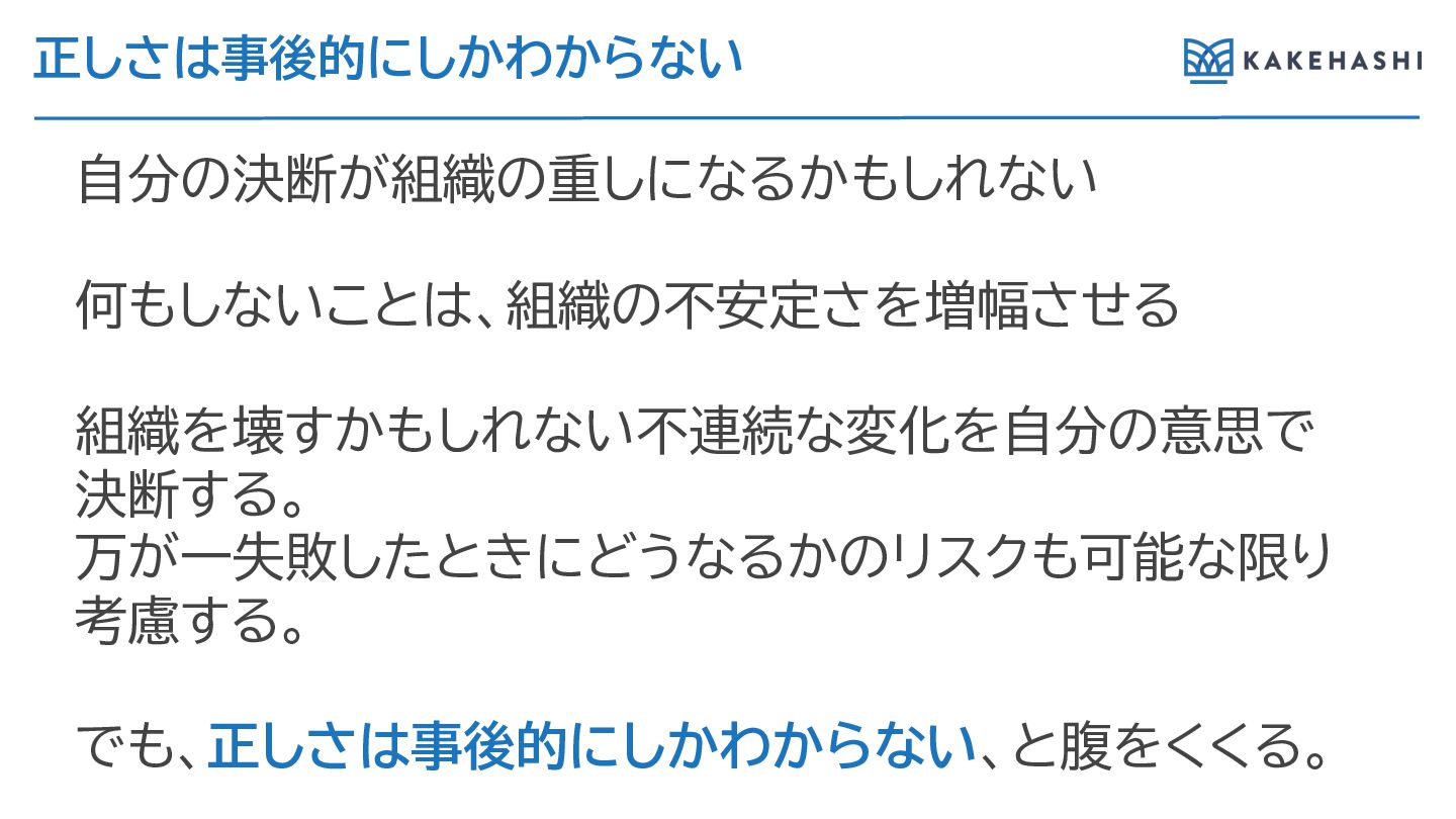 正しさは事後的にしかわか ない 自分の決断が組織の重しにな かもし ない 何もしないことは、組織の不安定さを増幅させ 組織を壊すかもし ない不連続な変化を自分の意思で 決断す 。