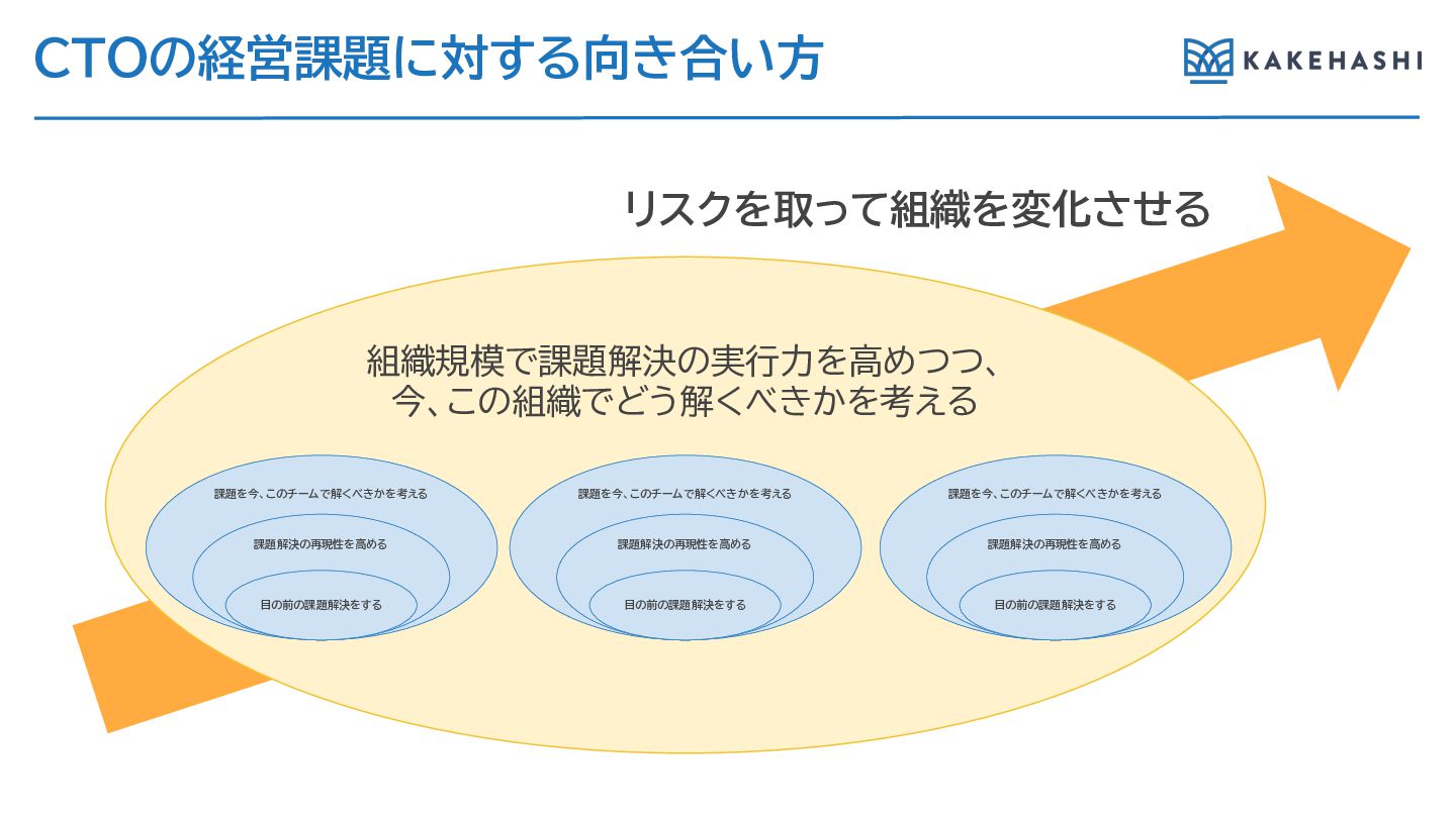 CTOの経営課題に対す 向き合い方 組織規模で課題解決の実行力を高めつつ、 今、この組織でどう解くべきかを考え 課題を今、このチームで解くべきかを考え 課題解決の再現性を高め 目の前の課題解決をす 課題を今、このチームで解くべきかを考え 課題解決の再現性を高め 目の前の課題解決をす