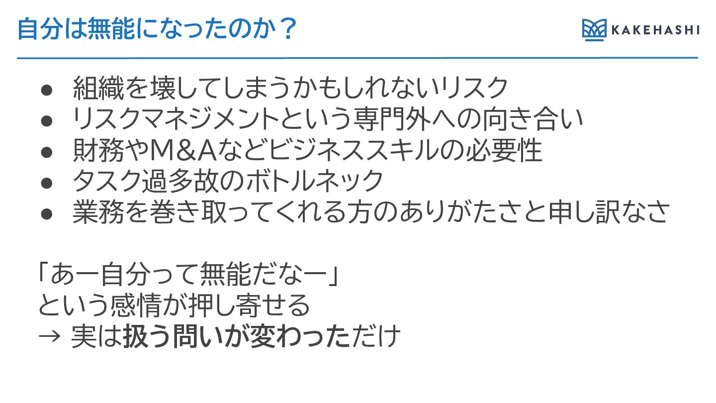 自分は無能になったのか? • 組織を壊してしまうかもし ないリスク • リスクマネジメントという専門外への向き合い • 財務やM&Aなどビジネススキルの必要性 • タスク過多故のボトルネック