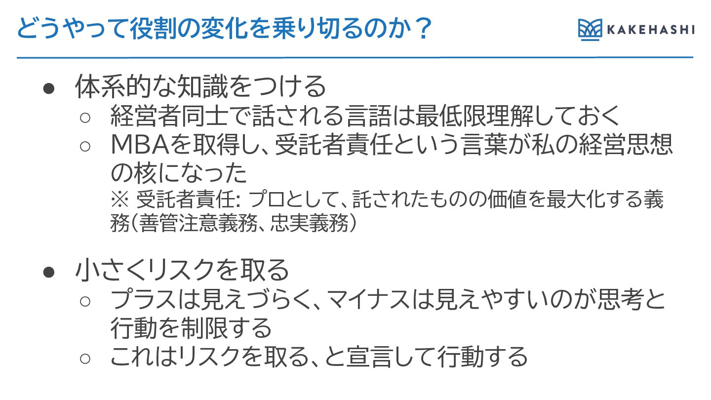どうやって役割の変化を乗 切 のか? • 体系的な知識をつけ ◦ 経営者同士で話さ 言語は最低限理解しておく ◦ MBAを取得し、受託者責任という言葉が私の経営思想