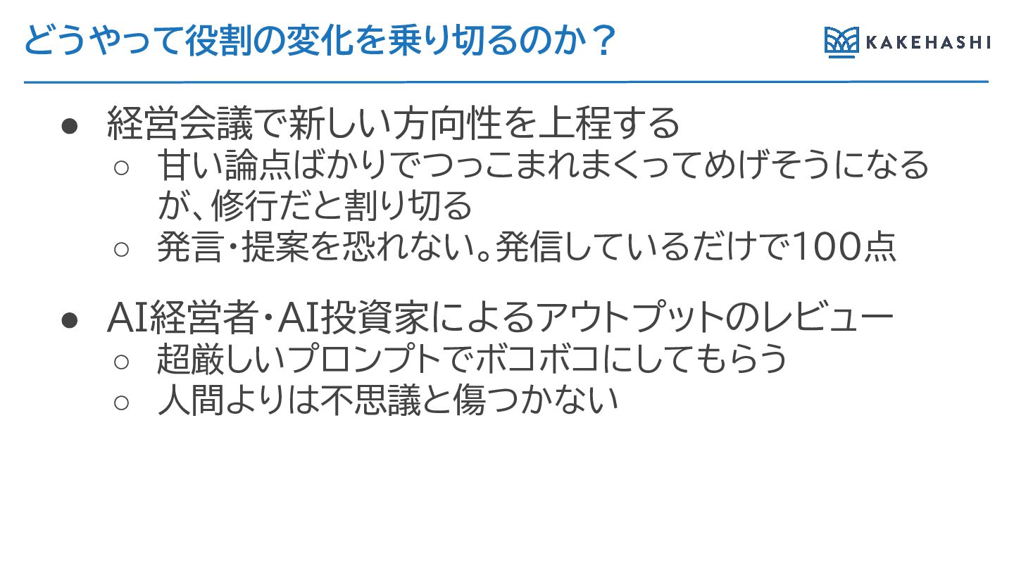 切 • AI経営者・AI投資家に アウトプットのレビュー ◦ 超厳しいプロンプトでボコボコにしても う ◦ 人間 は不思議と傷つかない