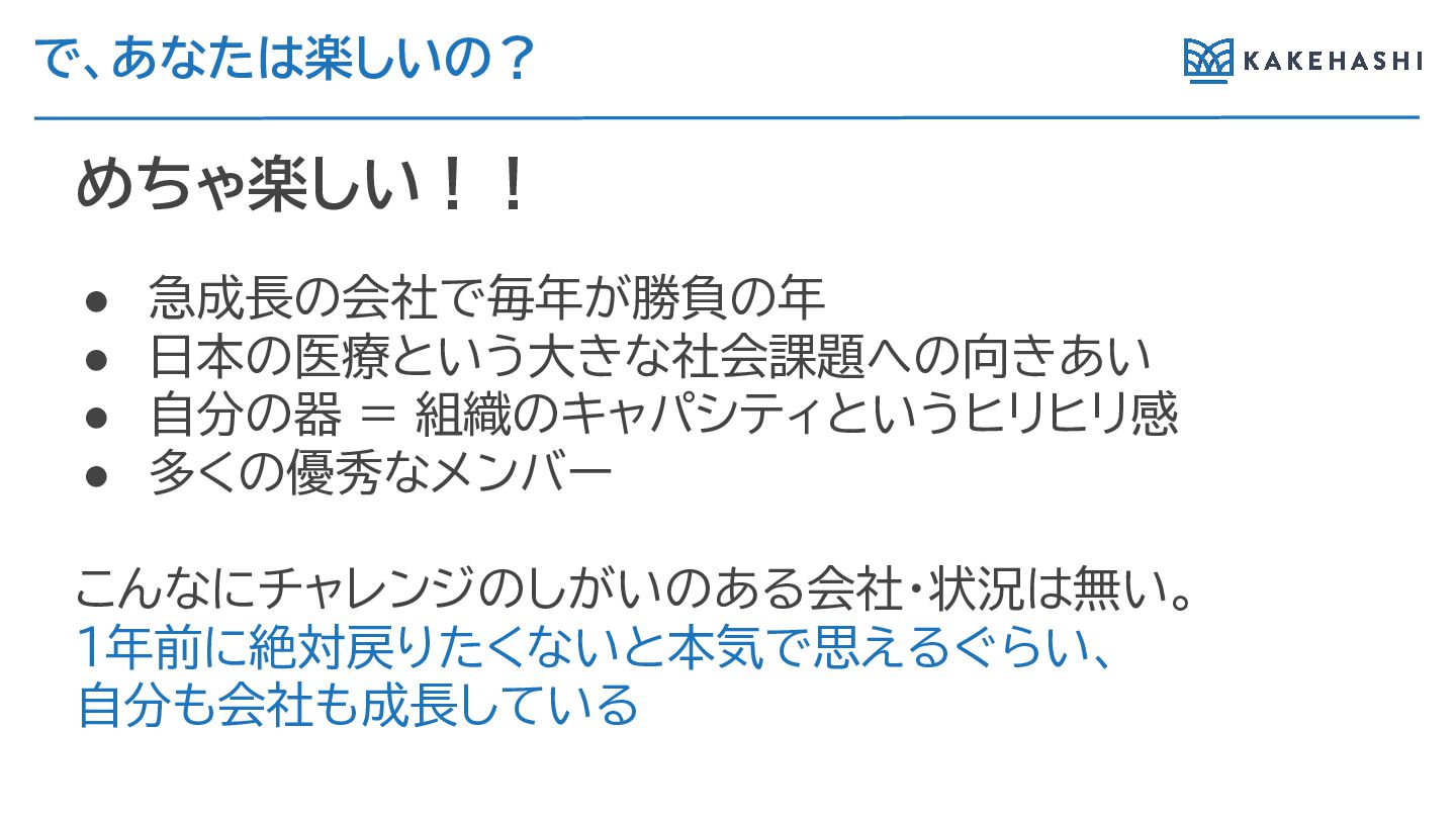 で、あなたは楽しいの? めちゃ楽しい!! • 急成長の会社で毎年が勝負の年 • 日本の医療という大きな社会課題への向きあい • 自分の器が組織のキャパシティにな う ヒリヒリ感