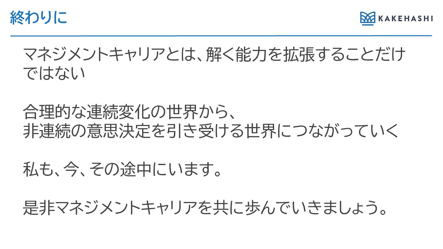 終わ に マネジメントキャリアとは、解く能力を拡張す ことだけ ではない 合理的な連続変化の世界か 、 非連続の意思決定を引き受け 世界につながっていく 私も、今、その途中にいます。