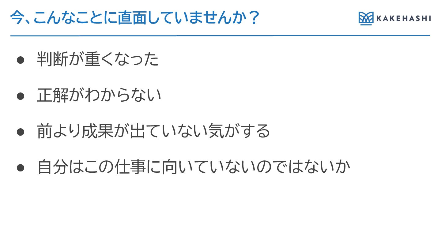 今、こんなことに直面していませんか? • 判断が重くなった • 正解がわか ない • 前 成果が出ていない気がす •