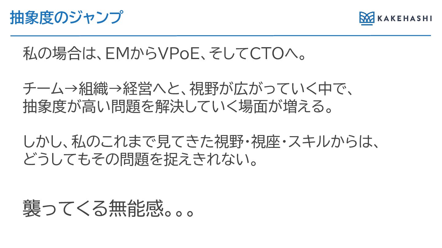 抽象度のジャンプ 私の場合は、EMか VPoE、そしてCTOへ。 チーム→組織→経営へと、視野が広がっていく中で、 抽象度が高い問題を解決していく場面が増え 。 しかし、私のこ まで見てきた視野・視座・スキルか は、 どうしてもその問題を捉えき