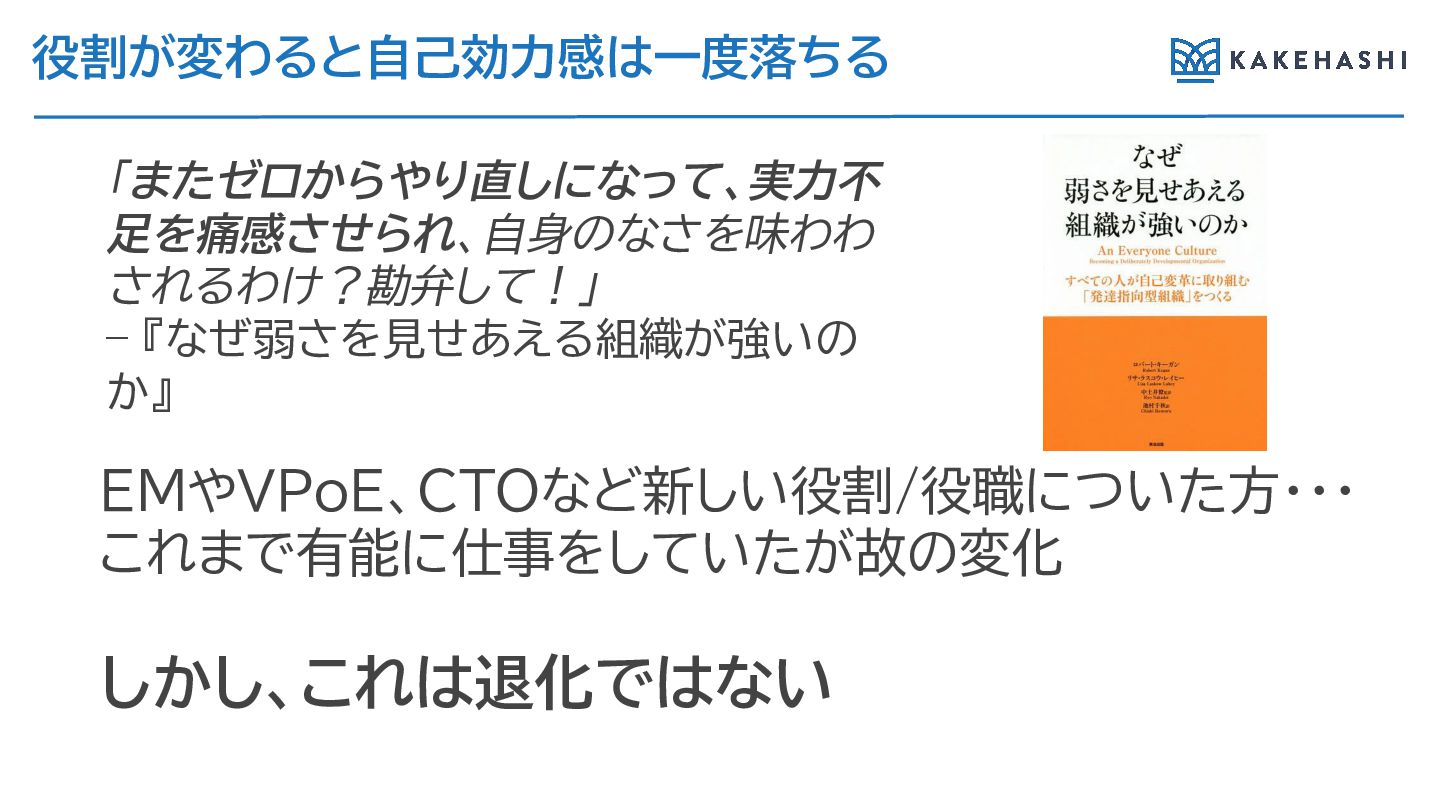 『なぜ弱さを見せあえ 組織が強いの か』 EMやVPoE、CTOなど新しい役割/役職についた方・・・ こ まで有能に仕事をしていたが故の変化 しかし、こ は退化ではない