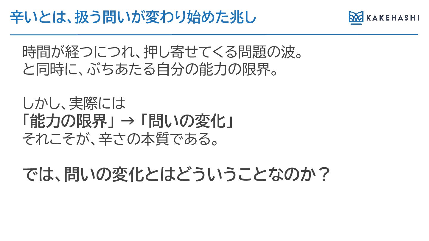 辛いとは、扱う問いが変わ 始めた兆し 時間が経つにつ 、押し寄せてく 問題の波。 と同時に、ぶちあた 自分の能力の限界。 しかし、実際には 「能力の限界」 →