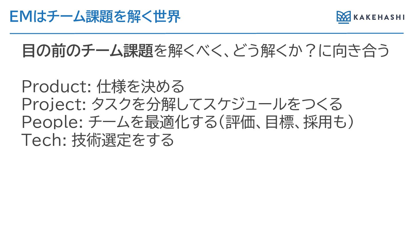 EMはチーム課題を解く世界 目の前のチーム課題を解くべく、どう解くか?に向き合う Product: 仕様を決め Project: タスクを分解してスケジュールをつく People: チームを最適化す (評価、目標、採用も) Tech: