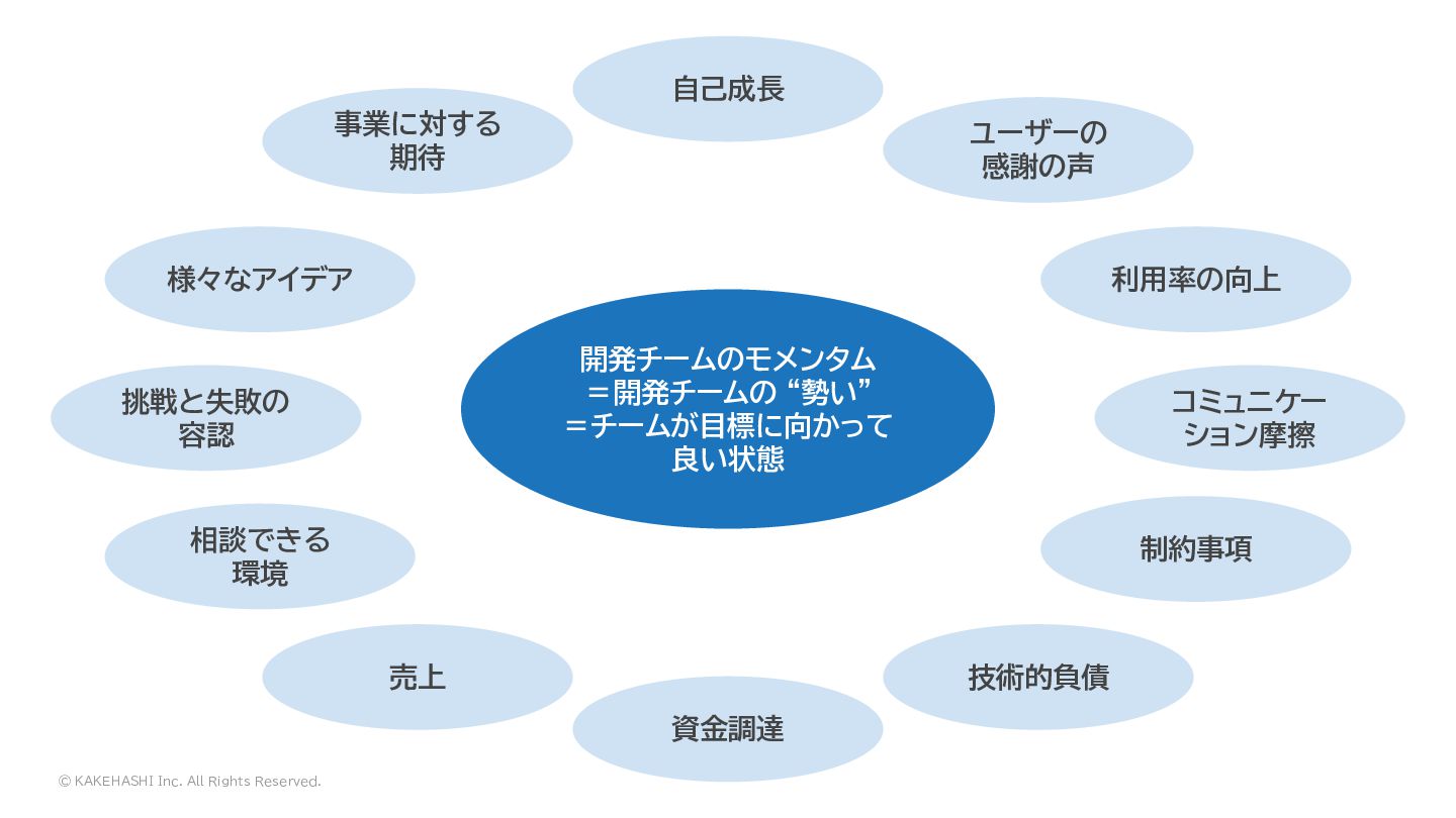 “勢い” =チームが目標に向かって 良い状態 自己成長 資金調達 売上 ユーザーの 感謝の声 利用率の向上 様々なアイデア 相談できる 環境 制約事項 技術的負債 コミュニケー ション摩擦 挑戦と失敗の 容認