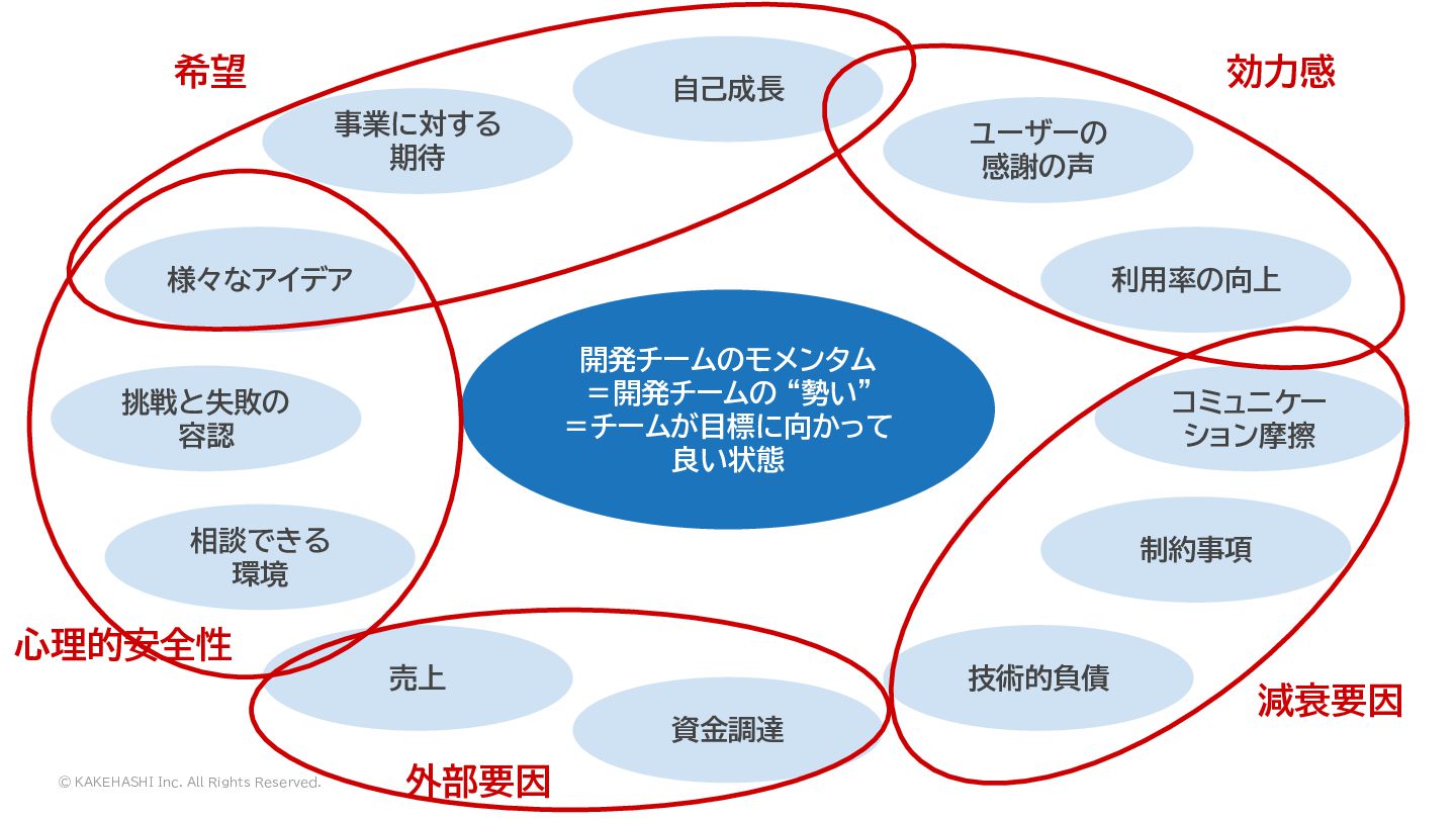 “勢い” =チームが目標に向かって 良い状態 自己成長 資金調達 売上 ユーザーの 感謝の声 利用率の向上 様々なアイデア 相談できる 環境 制約事項 技術的負債 コミュニケー ション摩擦 挑戦と失敗の 容認 希望 効力感 減衰要因 外部要因 心理的安全性