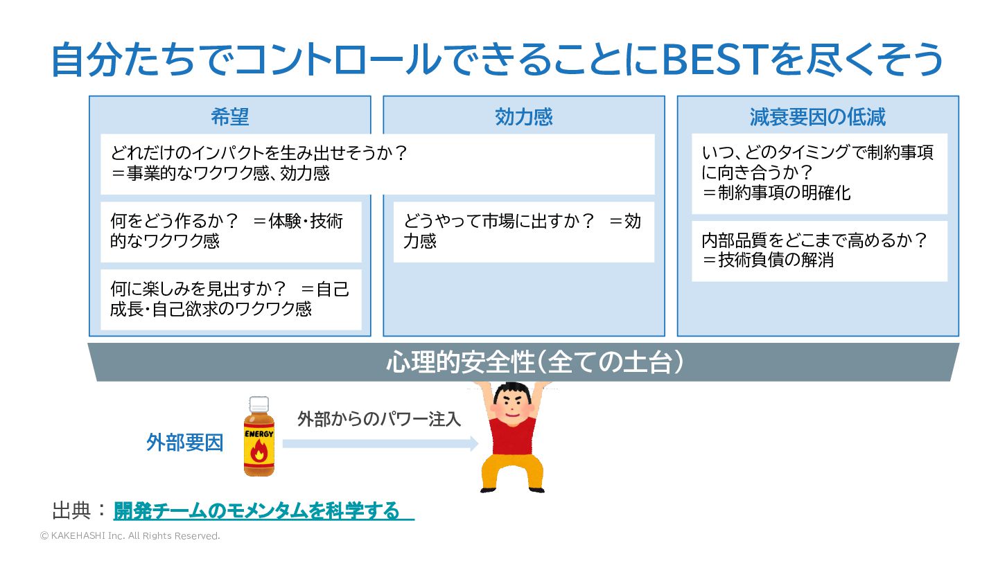 自分たちでコントロールできることにBESTを尽くそう 希望 効力感 減衰要因の低減 心理的安全性(全ての土台) どれだけのインパクトを生み出せそうか? =事業的なワクワク感、効力感 何をどう作るか? =体験・技術 的なワクワク感 どうやって市場に出すか? =効 力感 何に楽しみを見出すか? =自己 成長・自己欲求のワクワク感 いつ、どのタイミングで制約事項 に向き合うか? =制約事項の明確化 内部品質をどこまで高めるか? =技術負債の解消 外部からのパワー注入