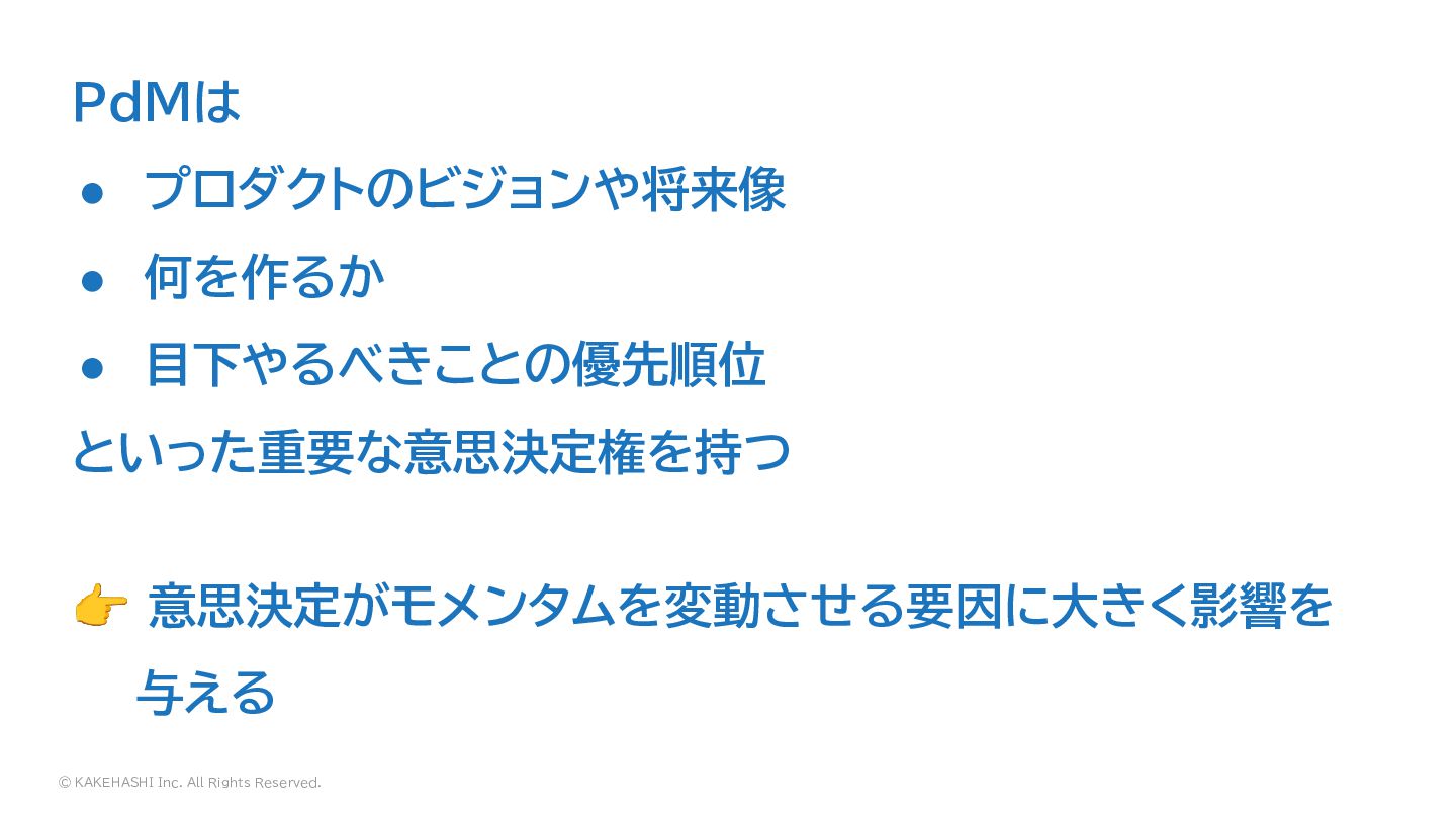 何を作るか • 目下やるべきことの優先順位 といった重要な意思決定権を持つ 👉 意思決定がモメンタムを変動させる要因に大きく影響を 与える