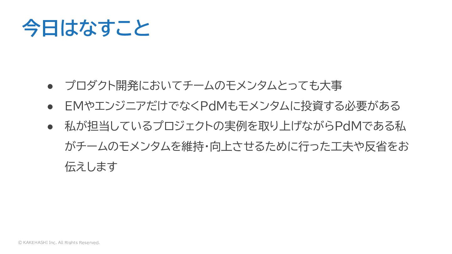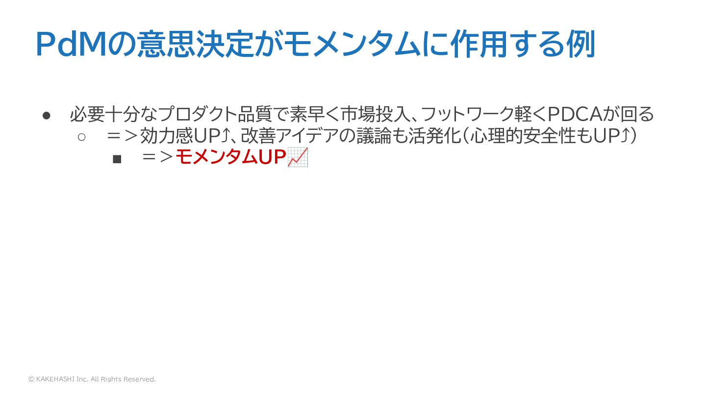 © KAKEHASHI Inc. All Rights Reserved. PdMの意思決定がモメンタムに作用する例 • 必要十分なプロダクト品質で素早く市場投入、フットワーク軽くPDCAが回る ◦