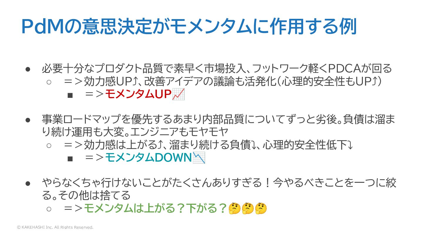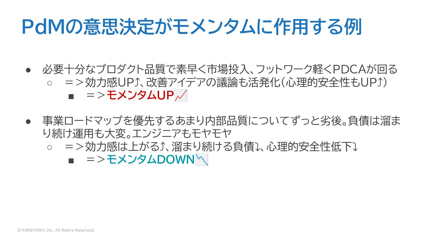 =>効力感UP⤴、改善アイデアの議論も活発化(心理的安全性もUP⤴) ▪ =>モメンタムUP📈 • 事業ロードマップを優先するあまり内部品質についてずっと劣後。負債は溜ま り続け運用も大変。エンジニアもモヤモヤ ◦ =>効力感は上がる⤴、溜まり続ける負債⤵、心理的安全性低下⤵ ▪ =>モメンタムDOWN📉 • やらなくちゃ行けないことがたくさんありすぎる!今やるべきことを一つに絞 る。その他は捨てる ◦ =>モメンタムは上がる?下がる?🤔🤔🤔