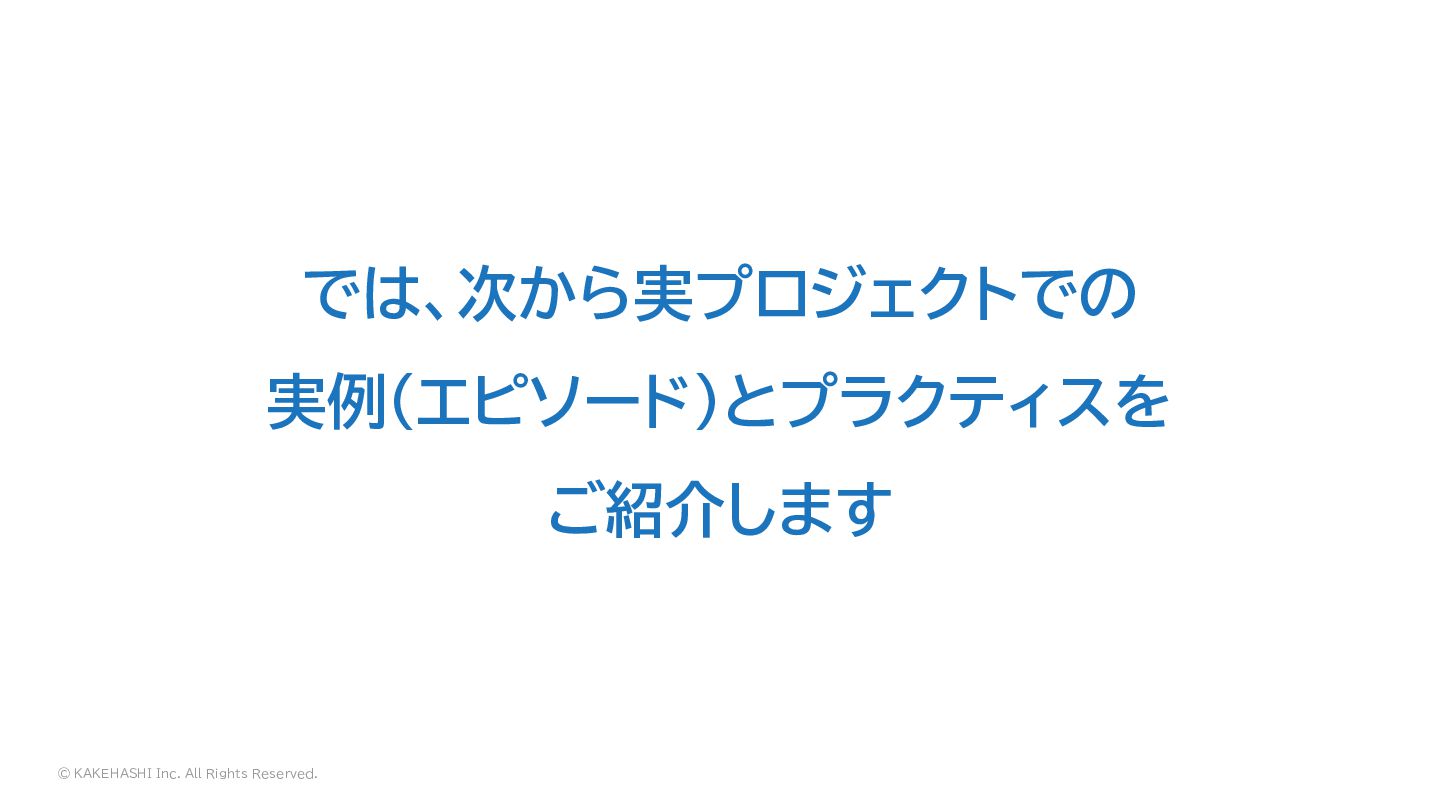 © KAKEHASHI Inc. All Rights Reserved. では、次から実プロジェクトでの 実例(エピソード)とプラクティスを ご紹介します