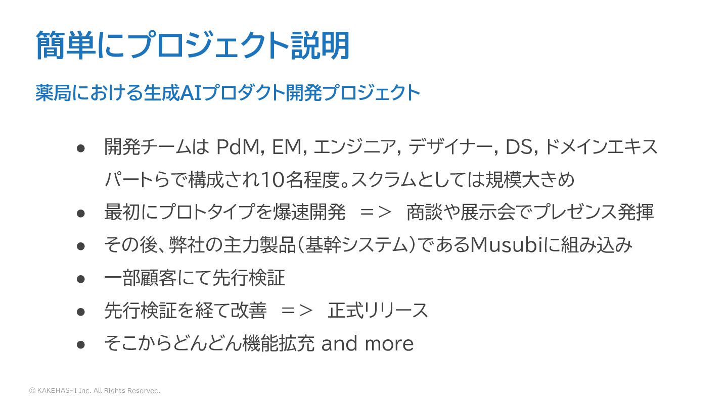 © KAKEHASHI Inc. All Rights Reserved. 簡単にプロジェクト説明 薬局における生成AIプロダクト開発プロジェクト • 開発チームは