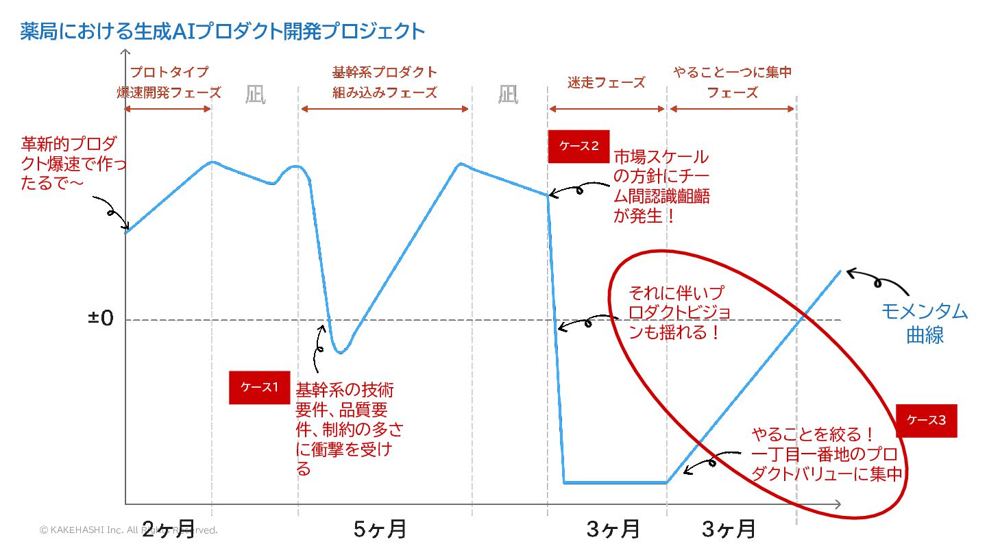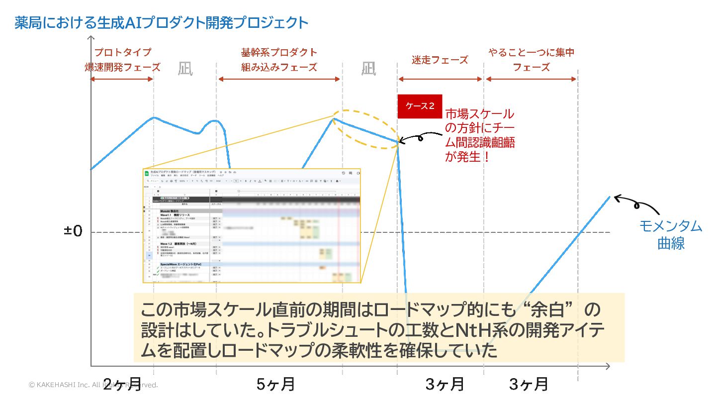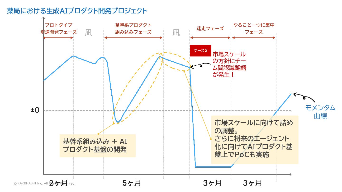 薬局における生成AIプロダクト開発プロジェクト モメンタム 曲線 市場スケール の方針にチー ム間認識齟齬 が発生! ケース2