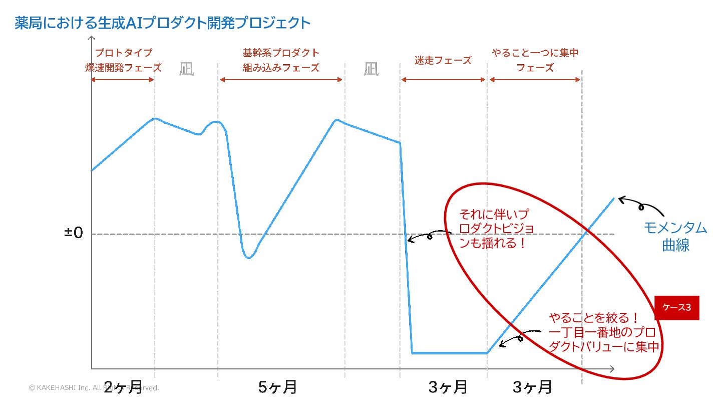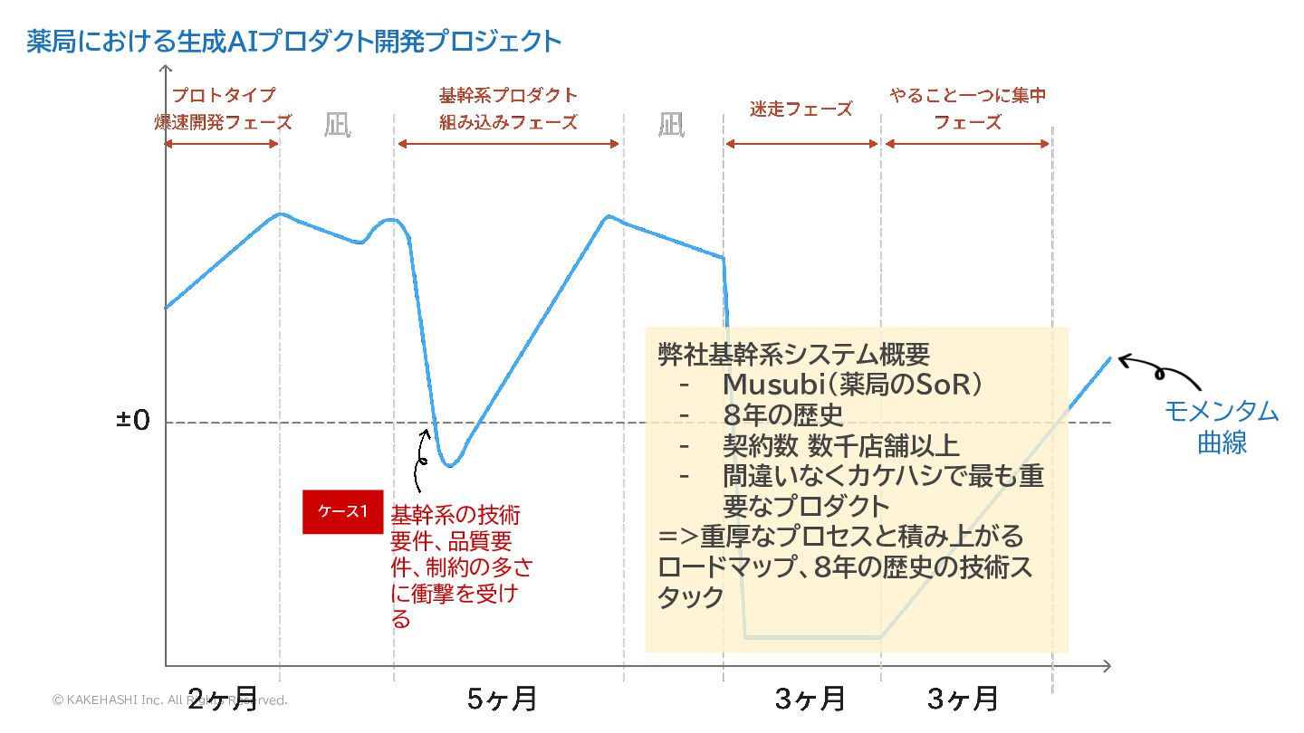 盤上でPoCも実施 基幹系組み込み + AI プロダクト基盤の開発 薬局における生成AIプロダクト開発プロジェクト モメンタム 曲線 市場スケール の方針にチー ム間認識齟齬 が発生! ケース2