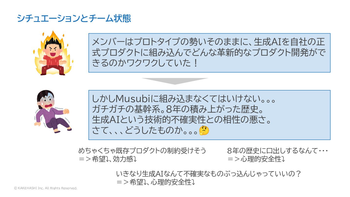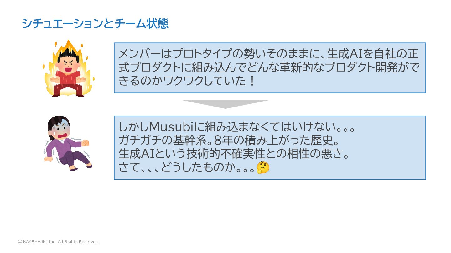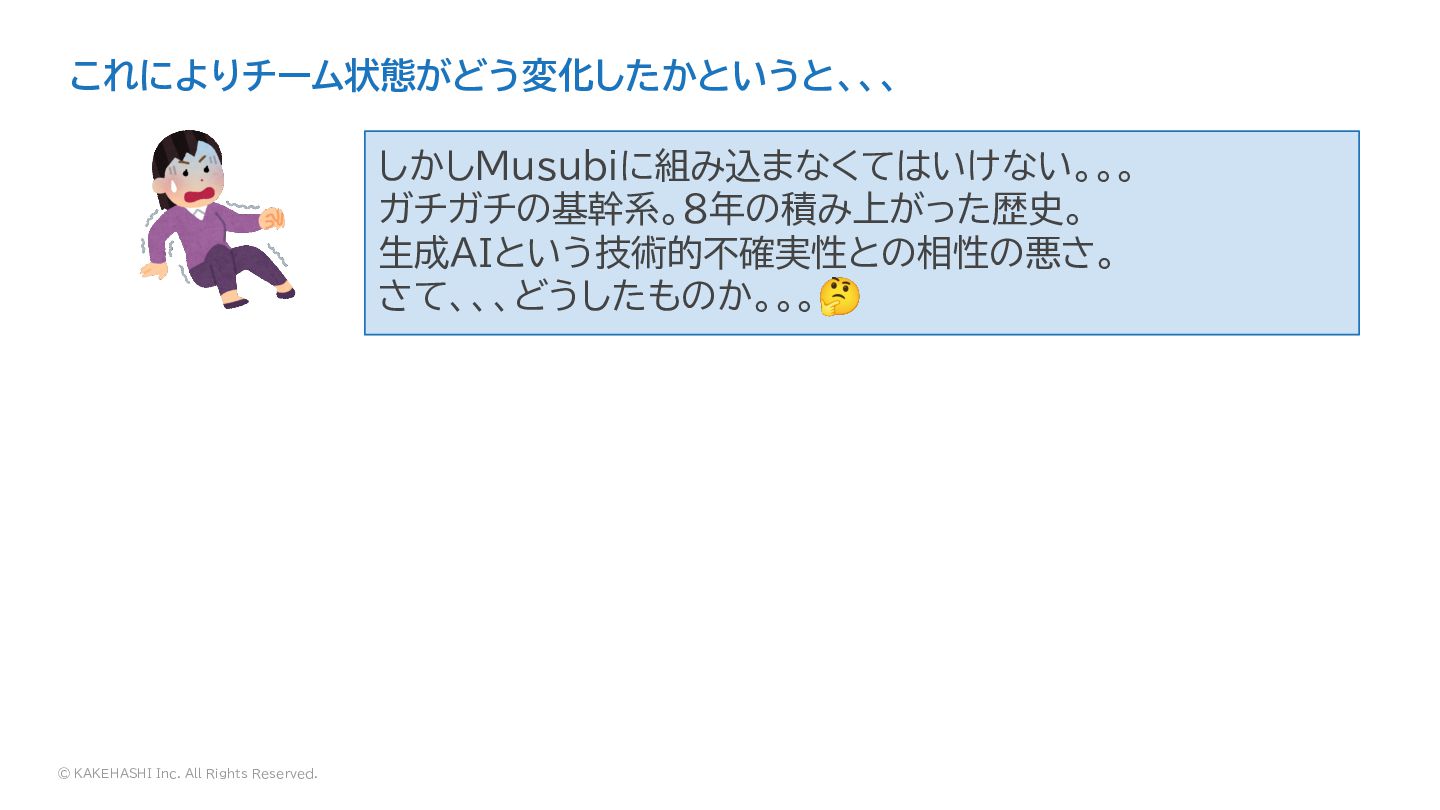 © KAKEHASHI Inc. All Rights Reserved. メンバーはプロトタイプの勢いそのままに、生成AIを自社の正 式プロダクトに組み込んでどんな革新的なプロダクト開発がで きるのかワクワクしていた! しかしMusubiに組み込まなくてはいけない。。。