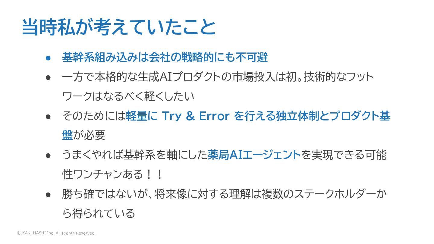 一方で本格的な生成AIプロダクトの市場投入は初。技術的なフット ワークはなるべく軽くしたい • そのためには軽量に Try & Error を行える独立体制とプロダクト基 盤が必要 • うまくやれば基幹系を軸にした薬局AIエージェントを実現できる可能 性ワンチャンある!! • 勝ち確ではないが、将来像に対する理解は複数のステークホルダーか ら得られている