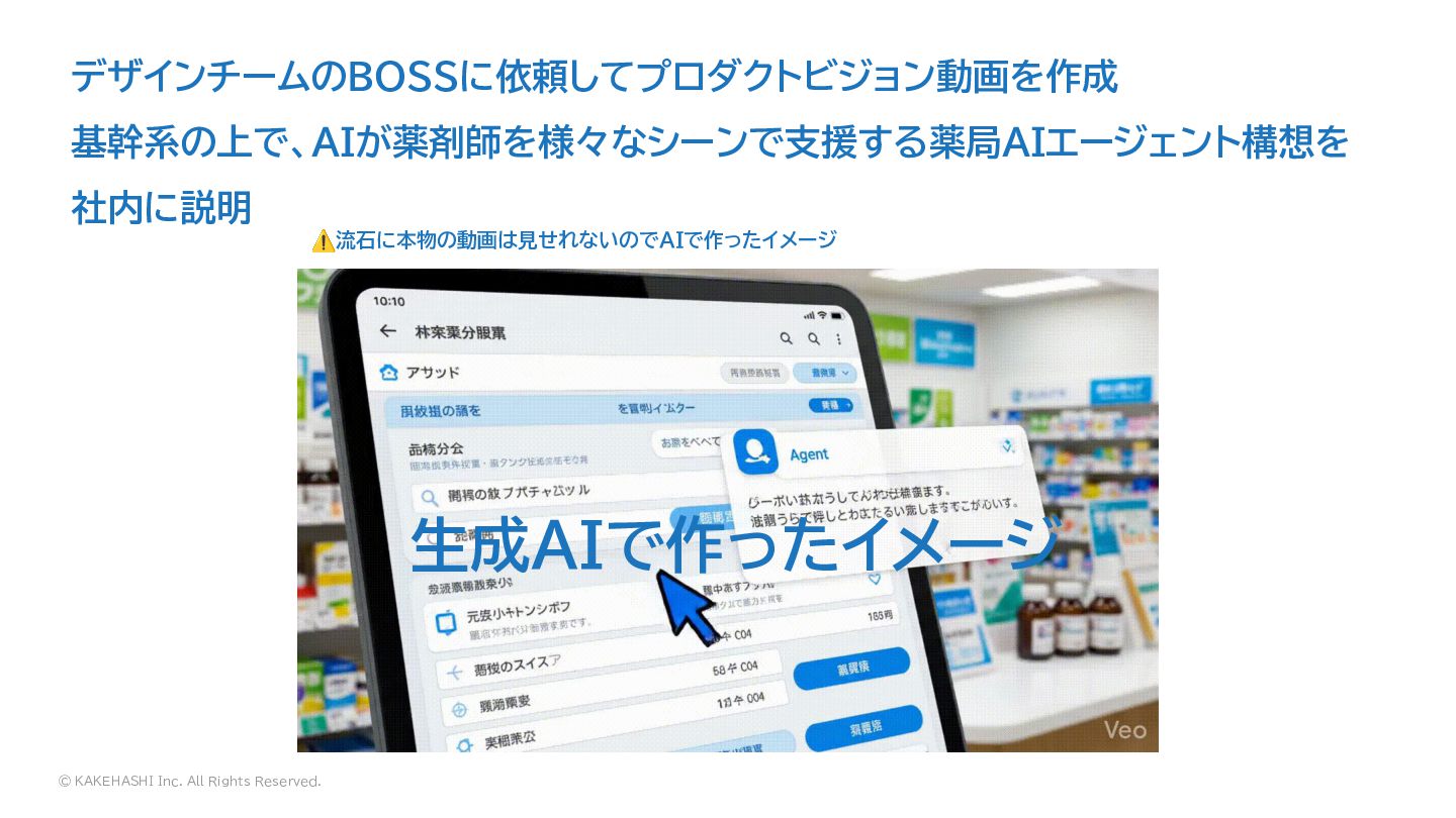 © KAKEHASHI Inc. All Rights Reserved. 生成AIで作ったイメージ デザインチームのBOSSに依頼してプロダクトビジョン動画を作成 基幹系の上で、AIが薬剤師を様々なシーンで支援する薬局AIエージェント構想を 社内に説明